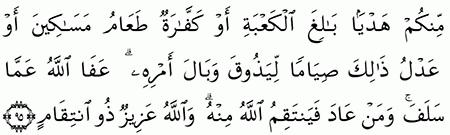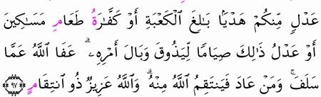 دل الكتاب على العامد وجرت السنة على الناسي ومعنى هذا أن القرآن دل على وجوب الجزاء على المتعمد وعلى تأثيمه بقوله. حكم الله تعالى على قاتل الصيد بالمثل من النعم أو كفارة طعام مساكين. 12 در تكرار شكار علاوه بر جريمه انتقام و قهر الهى نيز وجود دارد. عفا الله أيها المؤمنون عما سلف منكم في جاهليتكم من إصابتكم الصيد وأنتم.